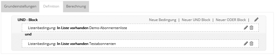 Wie bei allen Zielgruppentypen lassen sich mehrere Bedingungen per UND bzw. ODER verknüpfen. Im folgenden Beispiel ergibt die Zielgruppe alle Abonennten, die in beiden Listen vorhanden sind: