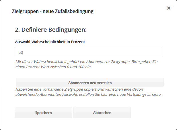 Bedingung anhand einer Zufallsauswahl von AbonnentenIn dieser Zielgruppe wählen Sie Abonnenten mit einer einstellbaren Wahrscheinlichkeit von 0 bis 100% zufällig aus. Während die Funktion 'A/B-Test' auf direktem Weg den Vergleich von Mailingvarianten automatisiert, dient die Zufalls-Zielgruppe als Basis für Vergleichstests aller Art, vor allem in Kampagnen.