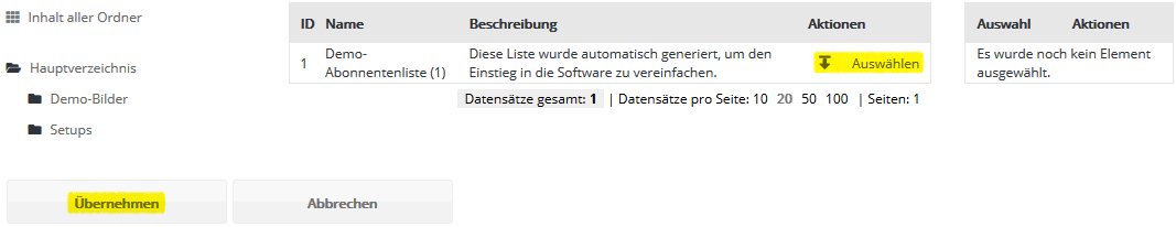 Schritt 3 - AbonnentenlistenWählen Sie nun aus, in welche Besser mit Butter Abonnentenliste ihre CSV-Datei importiert werden soll. Falls Sie zuvor keine eigene Abonnentenliste in Besser mit Butter angelegt haben (siehe Menü Abonnentenlisten), steht zum schnellen Einstieg die leere Abonnentenliste 'Demo-Liste' bereit. Diese Liste wird in der Regel bei der Einrichtung Ihres Besser mit Butter Kontos angelegt und zur Demonstration mit einem Beispiel-Abonnenten befüllt.