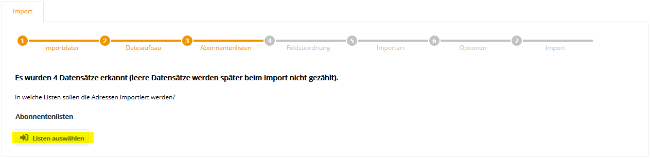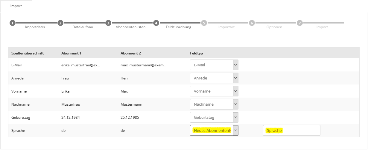 Auch die Auswahl mehrerer Abonnentenlisten ist möglich, falls Sie parallel in mehrere Listen importieren möchten. Klicken Sie nach Auswahl der gewünschten Liste(n) auf 'Übernehmen' und anschließend auf 'Weiter'. Der Name einer Abonnentenliste lässt sich im Menü Abonnentenlisten auch nachträglich jederzeit ändern. Schritt 4 - FeldzuordnungIn Schritt 4 teilen Sie Besser mit Butter mit, welche Spalte (z.B. Vorname, Nachname) Ihrer CSV-Datei in welches Besser mit Butter Abonnentenfeld importiert werden soll. Zum schnellen Einstieg sind typische Abonnentenfelder wie 'E-Mail', 'Anrede', 'Vorname' und 'Nachname' in Besser mit Butter bereits vorhanden.