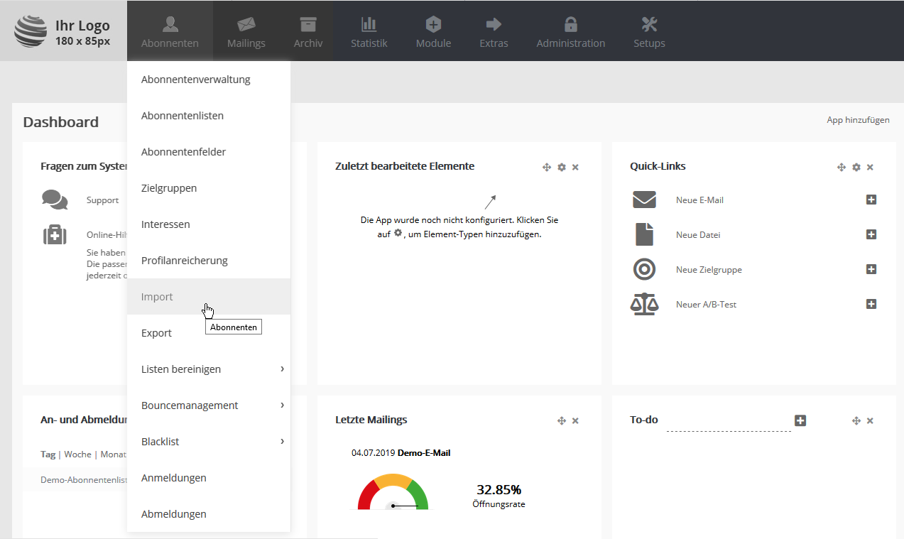 Zum Abspeichern Ihrer Daten wählen Sie bitte je nach Version Ihres Office-Paketes das Exportformat CSV UTF8 (Trennzeichen-getrennt) oder CSV (Trennzeichen-getrennt). Import Schritt für Schritt erklärtUm Ihre CSV-Datei in Besser mit Butter zu importieren, wählen Sie im Menü 'Abonnenten' den Punkt 'Import':