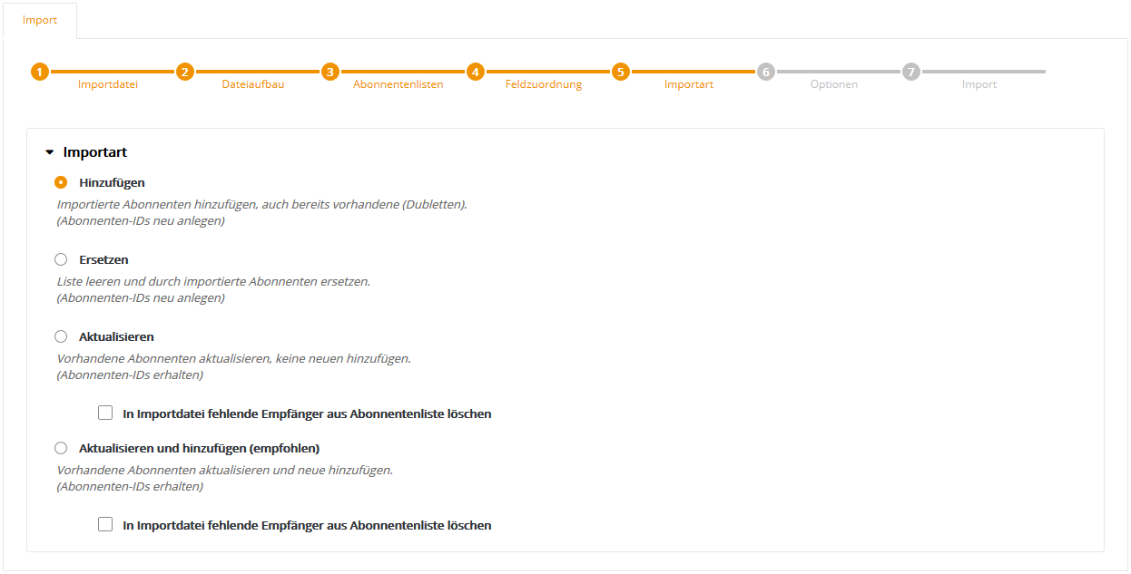 --> Importart: ErsetzenAlle Daten der ausgewählten Liste(n) werden gelöscht und durch den importierten Inhalt der CSV-Datei ersetzt. Bitte beachten Sie, dass mit den aus der Liste gelöschten Abonnenten auch deren bisheriges Nutzerverhalten (Öffnungen, Klicks, Bounces), wie z.B. 'hat letztes Mailing erhalten' und darauf aufbauende Zielgruppen-Definitionen verloren gehen. Sollte das nicht gewünscht sein, ist 'Importart: Aktualisieren und hinzufügen' die passende Alternative.