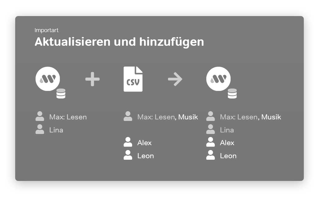 Im Beispiel würden Max und Lina gelöscht, anschließend Alex und Leon neu angelegt. --> Importart: Aktualisieren