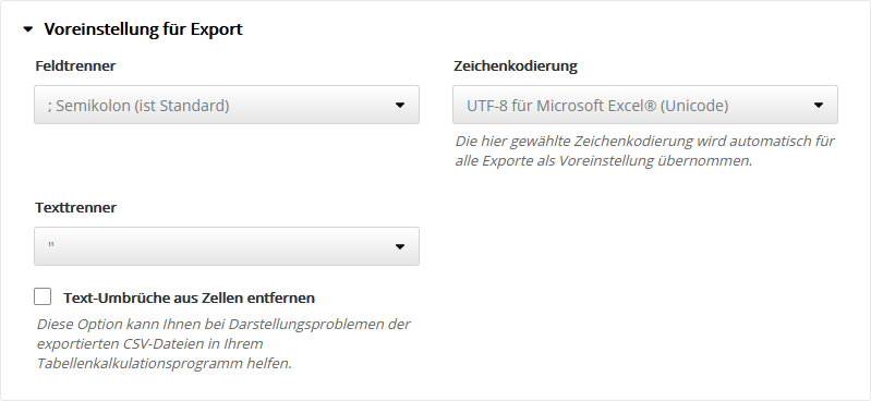 Folgende 'HTML-Editoren' sind in Besser mit Butter integriert und nutzbar: Grundeinstellung ExportHier legen Sie die Voreinstellung für den Export von CSV-Dateien fest, z. B. für den Export von Abonnentendaten. Bei der Durchführung jedes Exportes können Sie bei Bedarf auch eine abweichende Einstellung wählen. Standardeinstellung ist die Option 'UTF-8 für Microsoft Excel® (Unicode)', technisch gesprochen 'UTF-8 mit BOM'. Dieses Format wird von den meisten Officeanwendungen automatisch erkannt, so dass Umlaute und Sonderzeichen ohne manuelle Formatwahl korrekt importiert werden. StatistikeinstellungenTragen Sie Ihre eigenen Maximalwerte ein, um die rot|gelb|grün Farb-Umschaltung der Statistik-Anzeige für Öffungsrate, Klickrate und Bouncerate an die typischen Werte Ihrer Mailings anzupassen. Nur Ihre besten Mailings sollten den grünen Bereich erreichen. Die Farb-Umschaltung erfolgt automatisch in Drittel-Stufen des eingetragenen Maximalwertes. Empfehlung: Notieren Sie aus der Statistik Ihrer bisherigen Mailings die Durchschnittswerte für Öffnungsrate, Klickrate und Bounces. Damit dieser Durchschnittswert zukünftig im mittleren Drittel der Skala landet, tragen Sie das Doppelte dieses Wertes als Maximum in das jeweilige Feld ein. Tragen Sie z. B. 30% als Maximum ein, dann werden anschließend die Werte bis 10% rot, bis 20% gelb und darüberliegende Werte grün gefärbt. Sie sehen sofort, ob Ihr aktuelles Mailing über- oder unterdurchschnittlich abschneidet. Typische Durchschnittswerte: