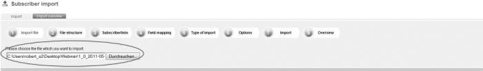 When choosing 'update' or 'update and add', the option 'Delete subscribers who are missing in the import file' is available. Consider the case that there are less data records that have to be updated in your import file than in the selected list. If you mark this option, all data records that do not have to be updated will be deleted from the subscriber list. Step 6 – OptionsChoose whether the imported data will be compared with the already in the system collected opt-outs. If so, decide whether the comparison is supposed to be globally or locally in only some lists. Then, all addresses which are already opted out will not be imported again. At this point, you may also add further settings to some types of import. These settings are meant for the fields that have to be updated and the identification fields (when choosing 'Add'). Otherwise, this step will be skipped. Step 7 – ImportCheck your settings for the upcoming import again. Subsequently start the import process by clicking 'Import'. Step 8 – OverviewA progress bar and corresponding system messages inform you about the progress of your data import. The message 'The Import has been successfully accomplished' points out that the data has been successfully imported to your subscriber list. In the announcement you can see how many data records have been imported altogether. In addition to that, Besser mit Butter tells you how many invalid addresses were found in the imported data records, in which lists the data was imported, and which type of import was used.
