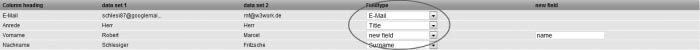 if the first line of your address file contains (as shown in the example above) the column headings, leave the item 'First line contains column headings' marked . Otherwise, if your address file starts right away with the subscriber data, unmark this option. Step 3 – Subscriber ListsChoose the subscriber list to which you want to import the addresses. Subsequently click on 'Next'. Step 4 – Field MappingNow you are asked to match the field names of your subscriber data with those of Besser mit Butter. In order to do so, please choose in the drop down menus the associations which correspond to field information displayed to the left of these menus. If there does not exist a matching subscriber field, choose 'New Field' and enter a name for the subscriber field that needs to be created. Click 'Next'.