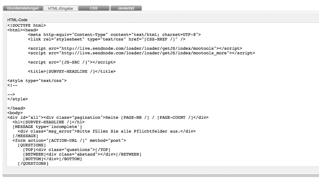 Insert your entire html source code. By creating a new template, Besser mit Butter generates a sample html source code with all important survey-placeholders automatically in this tab.