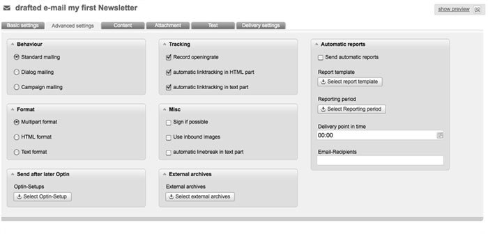 If you want to link to Google, for example, the text that is supposed to be linked must be selected, the icon clicked and the target URL in the address field entered. In order to make the links evaluable for the statistics, they should get tracked. For this, you only have to tick in the according link dialog. Furthermore, it is possible to track all links at once. In order to do so, you can tick this option in the tab 'advanced settings'.