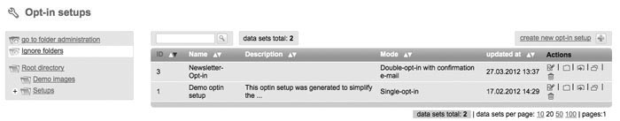 Through 'Setups' and 'Optin Setup' you can create forms, which can be included into your website. So interested parties can login automatically on your website for your subscriberlist(s). Please note: Requirement for a successfull 'optin setup' is to create an e-mail with type 'dialog mailing' for registration confirmation and welcoming, which got the status 'activated'. Otherwise those mailings will be lacking in the shortlist of mailings which you can choose for your optin setup. For an esier start Besser mit Butter gots a „Demo optin setup“ for you. Created optin setups can be 'opend' afterwards for editing, 'moving' to another folder or 'deleting'. If you have moved an optin setup into another folder, click 'open folder' to get into. Create new Optin setup |