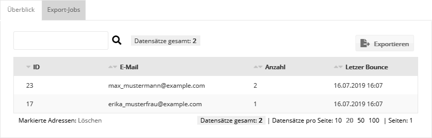 Reiter 'Überblick'Hier werden alle E-Mail-Adressen aufgelistet, deren Versendungen aufgrund von drei aufeinanderfolgenden Hardbounces zurückgehalten werden. Diese Adressen werden auf der Besser mit Butter-internen 'Retained List' gesammelt. Verwaltet werden hier ausschließlich die reinen E-Mail-Adressen, unabhängig von den dazugehörenden (eventuell ehemaligen) Abonnenten. Oben rechts können Sie mit Klick auf den 'Exportieren'-Button die zurückgehaltenen E-Mail-Adressen als CSV-Datei exportieren. Die erzeugte CSV-Datei lässt sich anschließend auf dem Reiter 'Export-Jobs' herunterladen.