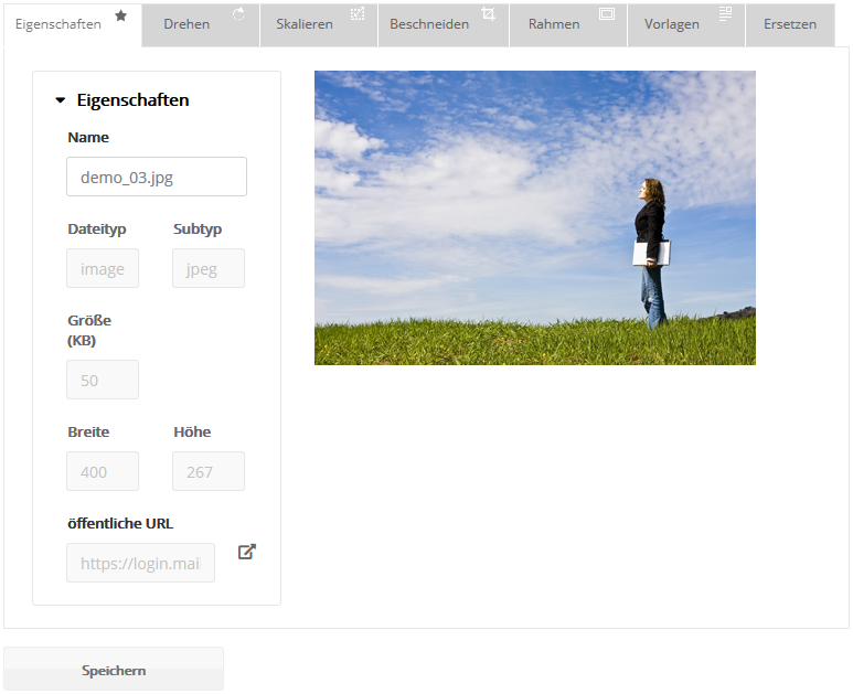 Hier erhalten Sie einen Überblick über die gespeicherten Informationen, wie Name, Dateityp und Bildgröße. Sie können den Namen ändern und sich den Link zur Datei kopieren, um diesen beispielsweise in einem Newsletter einzubinden.