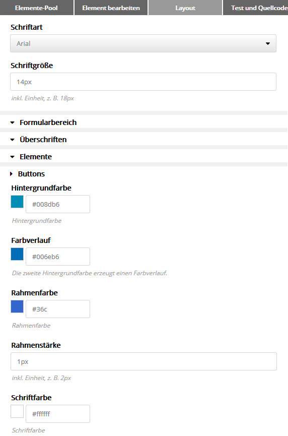 Hier bestimmen Sie die allgemeine Optik Ihres Formulars, wie Schriftart, Farben und innere/äußere Abstände. Jede Änderung ist sofort in der Vorschau sichtbar.