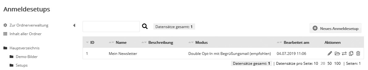 Rechtssichere Anmeldung nach DSGVOEin rechtssicheres Anmeldeformular sollte die im letzten Abschnitt genannten Felder und Hinweise enthalten. Neues Anmeldesetup erstellenKlicken Sie oben rechts 'Neues Anmeldesetup erstellen'. Geben Sie dem Setup einen Namen und (optional) eine Beschreibung. GrundeinstellungenWählen Sie den 'Modus' Ihres Anmeldesetups. Die rechtlich sichere Anmeldevariante ist das Double Opt-In, optional auch mit zusätzlicher Begrüßungs-Nachricht.