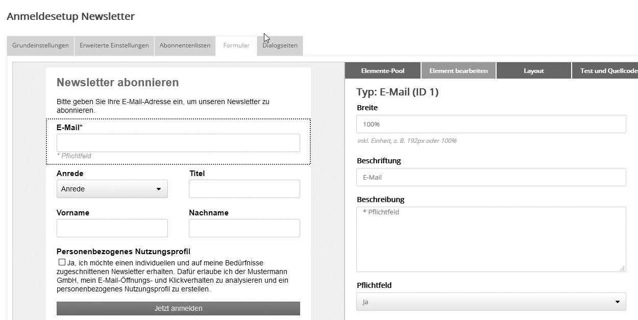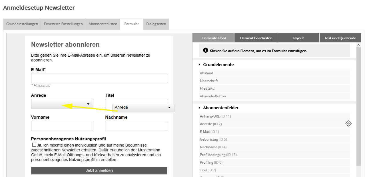 Im Bereich Unbestätigtes Double Opt-in verfällt nach (x Tagen) legen Sie fest, nach wievielen Tagen unbestätigte Double Opt-ins gelöscht werden. Nach unserer Statistik klicken 96% der Anmelder den Bestätigungslink in den ersten 24 Stunden nach Erhalt der Bestätigungsmail an. Je länger die Bestätigung ausbleibt, desto wahrscheinlicher liegt zu dieser Anmeldung kein Einverständnis des Adressinhabers vor. Das soll das Double Opt-in Verfahren aus Datenschutzgründen verhindern. Möglich sind Einstellungen von 1 bis 28 Tagen. Voreingestellt sind 14 Tage. In diesem Zeitraum gehen 99,8% der Bestätigungen ein. Nach Ablauf der eingestellten Frist wird eine unbestätigte Anmeldung aus unserer Datenbank gelöscht und der Bestätigungslink wird ungültig. Sie ist im Menü Anmeldungen nicht mehr enthalten und auch per Webservice nicht mehr verfügbar. AbonnentenlistenIm Reiter 'Abonnentenlisten' wählen Sie aus, in welche Liste(n) die neuen Anmeldungen eingetragen werden sollen. FormularAuf dem Reiter 'Formular' gestalten Sie Ihr Anmeldeformular. Die Ansicht besteht aus zwei Bereichen: Links sehen Sie die Vorschau, rechts alle verfügbaren Elemente und Bearbeitungsmöglichkeiten.