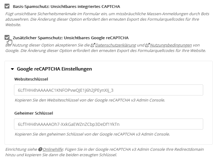 Basis-Spamschutz: Unsichtbares integriertes CAPTCHA Zusätzlicher Spamschutz: Unsichtbares Google reCAPTCHA