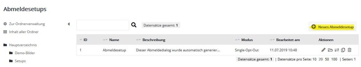 Ablauf einer AbmeldungKlickt der Empfänger den Abmeldelink an, wird ein in Besser mit Butter eingerichtetes 'Abmeldesetup' angestoßen und der Abonnent vom Newsletter-Empfang abgemeldet. Das kann je nach Einstellung entweder sofort oder nach nochmaliger Bestätigung (Double-Opt-Out, nicht empfehlenswert) passieren. In den Eigenschaften eines Abmeldesetups wählen Sie die Bestätigungsnachricht aus und optional die Abonnentenlisten, aus denen der Abonnent entfernt werden soll. Ist der Abonnent aufgrund der Abmeldung in keiner einzigen Abonnentenliste mehr enthalten, wird er auch aus der 'Abonnentenverwaltung' entfernt. Neues Abmeldesetup erstellen |